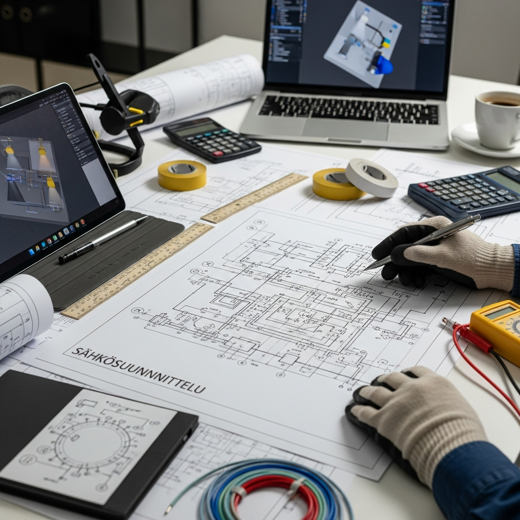 Laadimme selkeät sähkösuunnitelmat kotiin, mökille ja liiketilaan. Otamme huomioon kuormat, energiatehokkuuden, valaistuksen ja laajennettavuuden.
